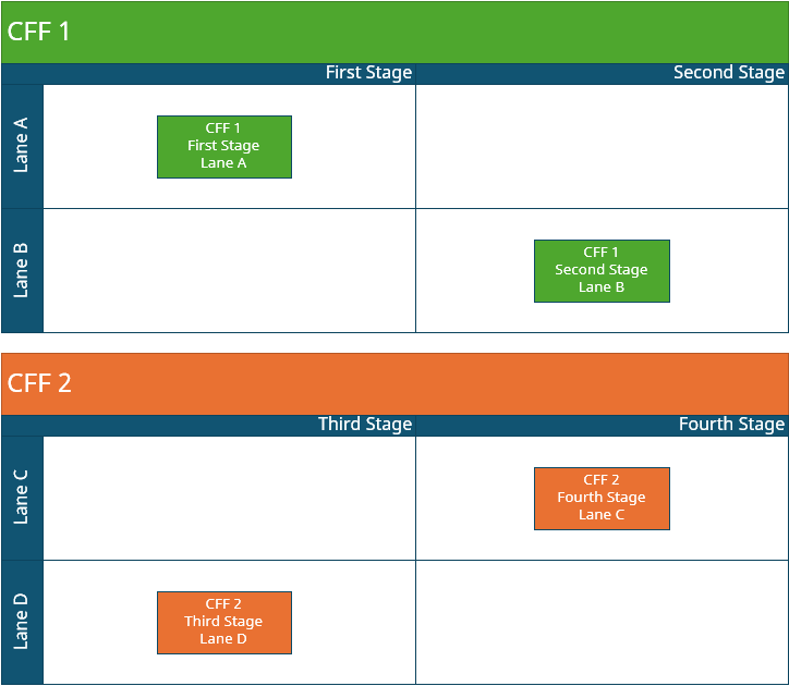 You can think of the CFF as being composed of shapes layered on top of each other. Each shape carries one or more categories that determine which shapes can become members of other shapes. In the picture above, CFF Container accepts any shape that has a category of 'CFF List' and, because Swimlane List (blue) and Phase List (green) define this value in their User cells, they become members of the container. A similar thing happens for Swimlane rows and Phase columns, which also become members of their respective lists.